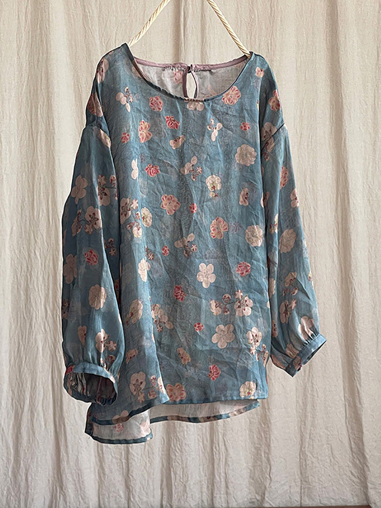 Women Summer Vintage Flower O-neck Ramie Shirt PP1039