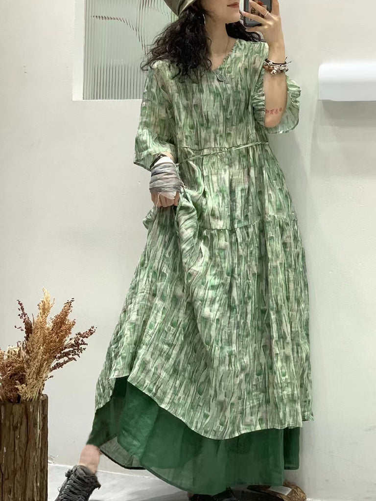 Women Summer Vintage Flower V-Neck Ramie Dress FG1013