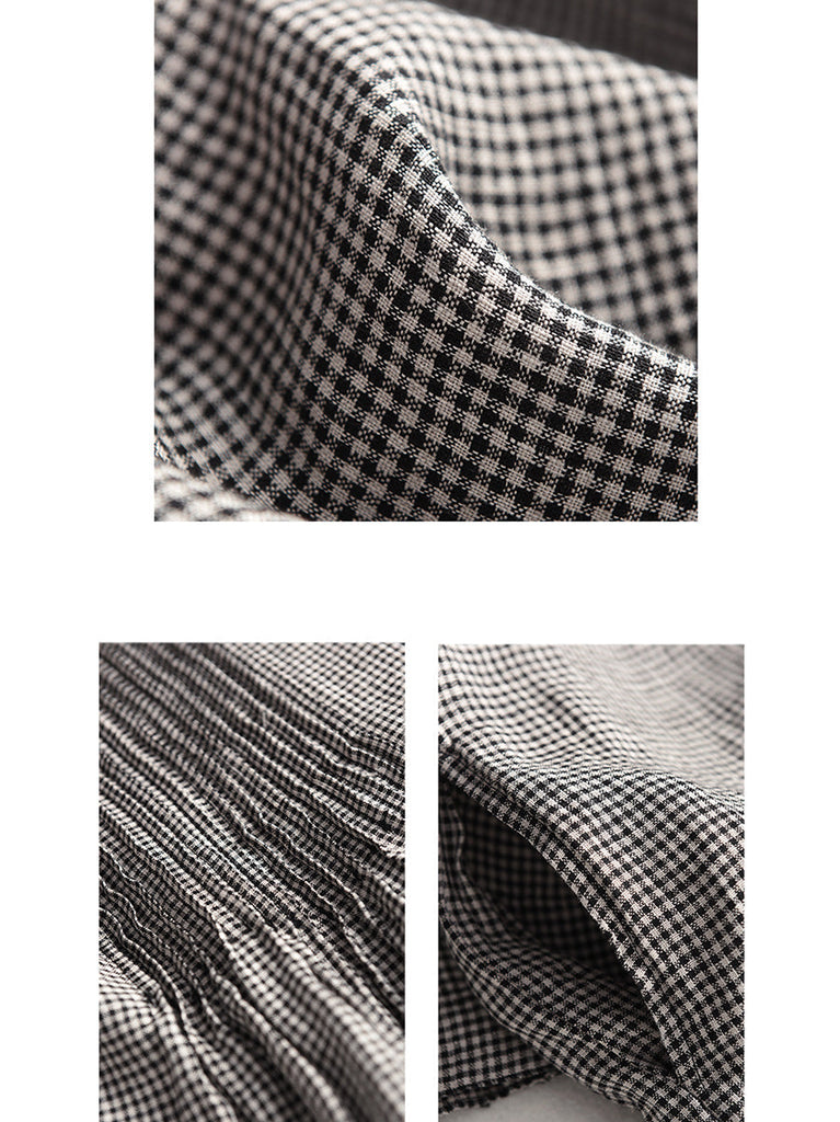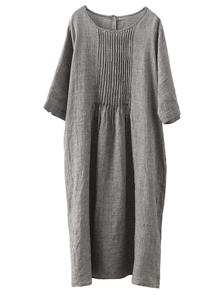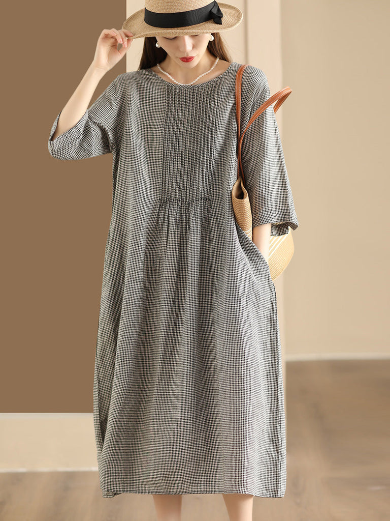 Women Summer Vintage Lattice Shirred O-Neck Ramie Dress OP1051