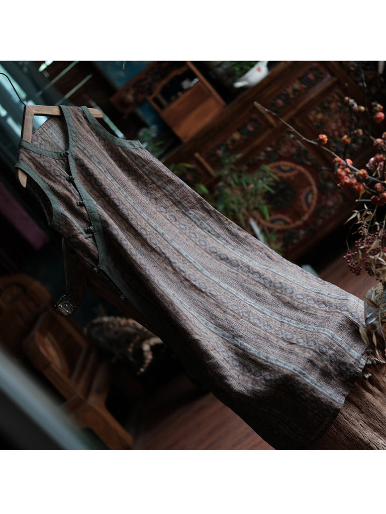 Women Summer Vintage Print Spliced Sleeveless Ramie Dress OP1013
