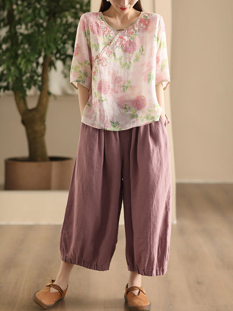 Women Summer Vintage Solid Linen Wide-leg Pants FD038