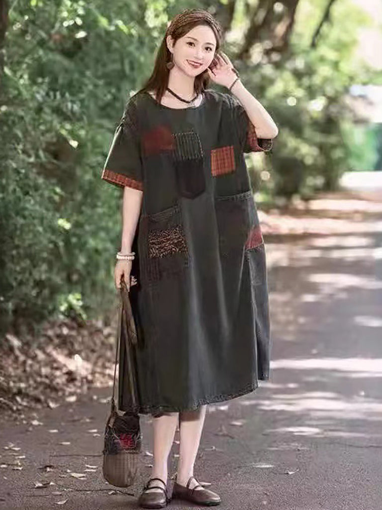 Women Summer Vintage Spliced Denim Loose Dress II1039