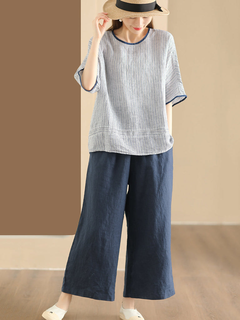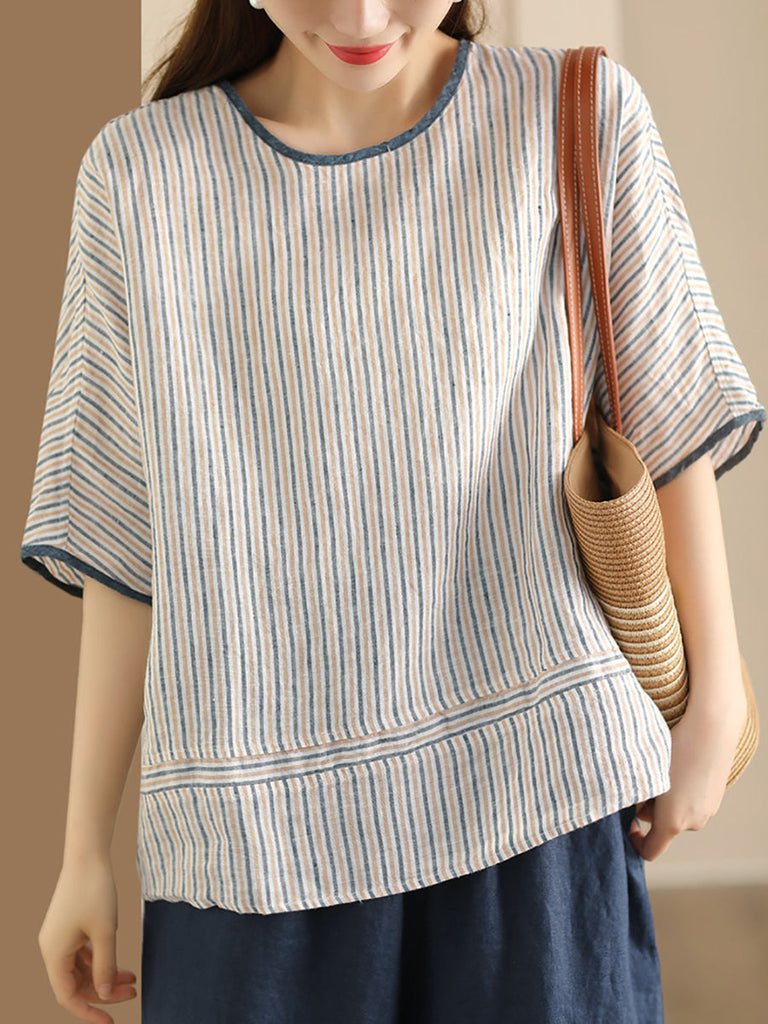 Crafted from high-quality linen and showcasing a classic stripe motif, this elegant shirt boasts an O-neck collar, raglan-style short sleeves, and a vintage design, making it the ideal choice for the warmer months.