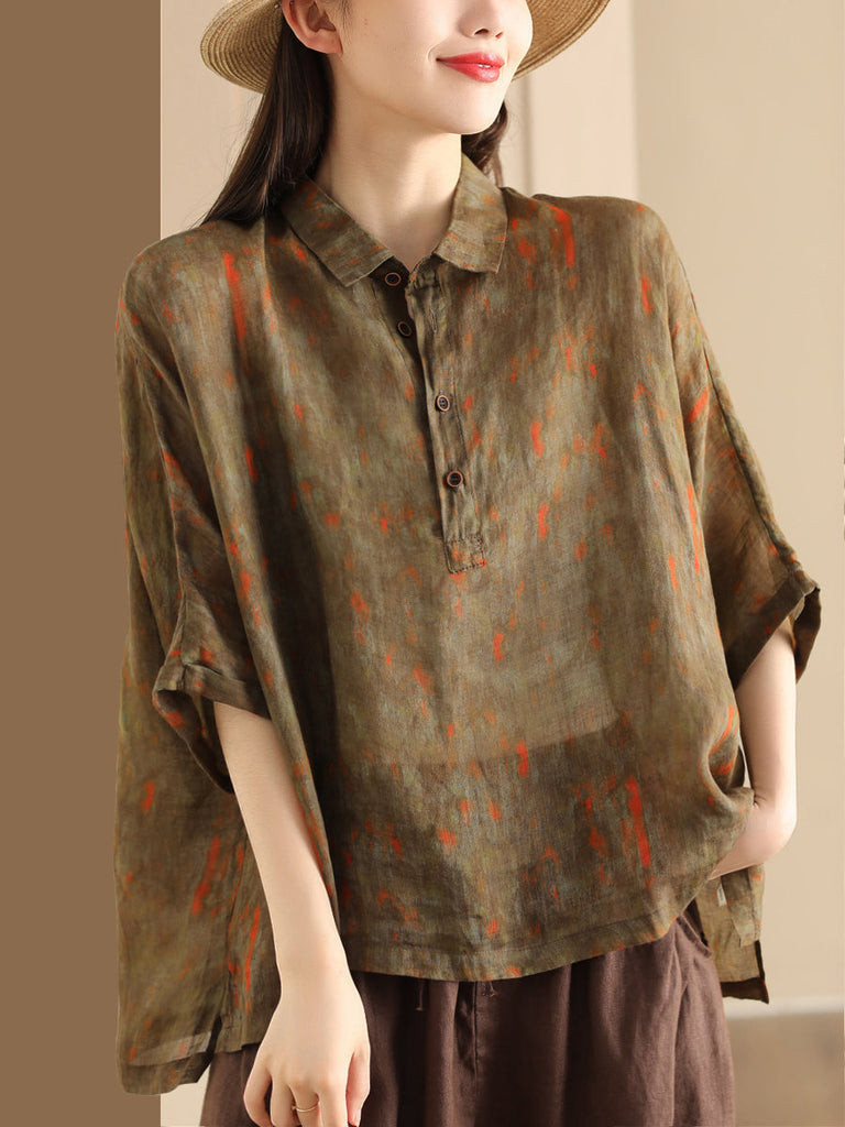 Women Summer Vintage Tie-dye POLO Ramie Shirt OO1045