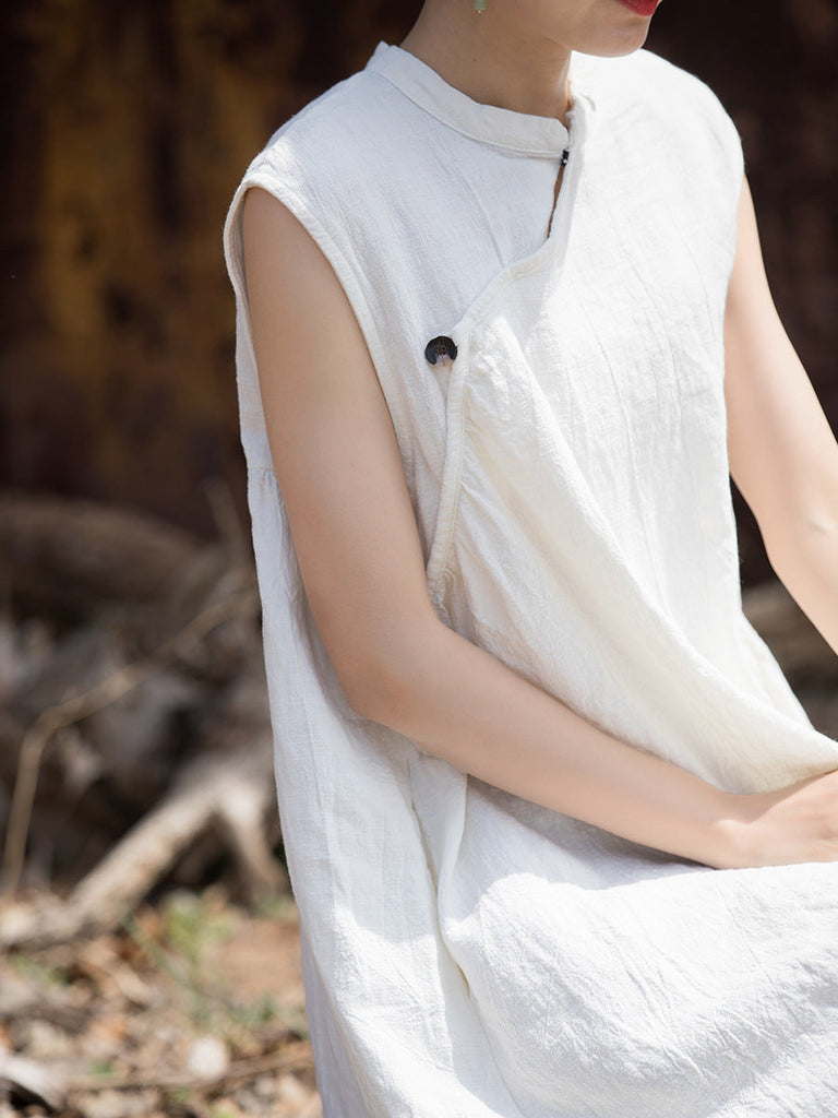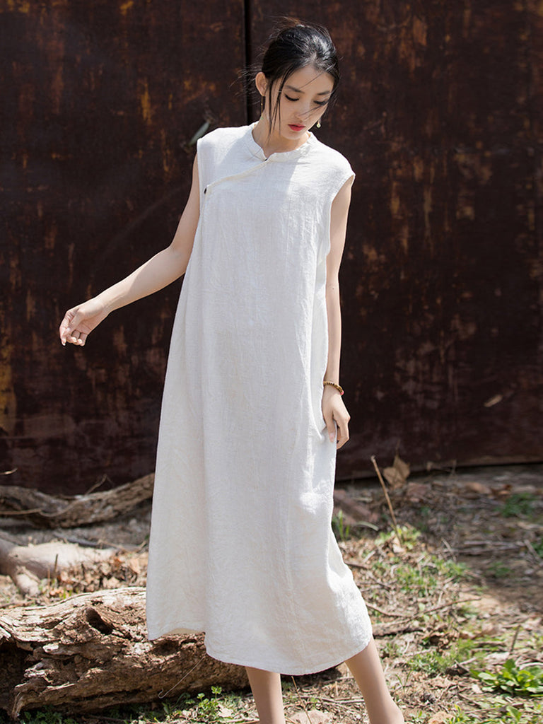 Women Summer Vintage Tie-dye Stand Collar Linen Dress FG1047
