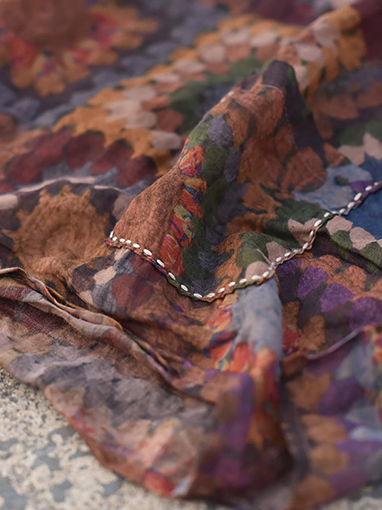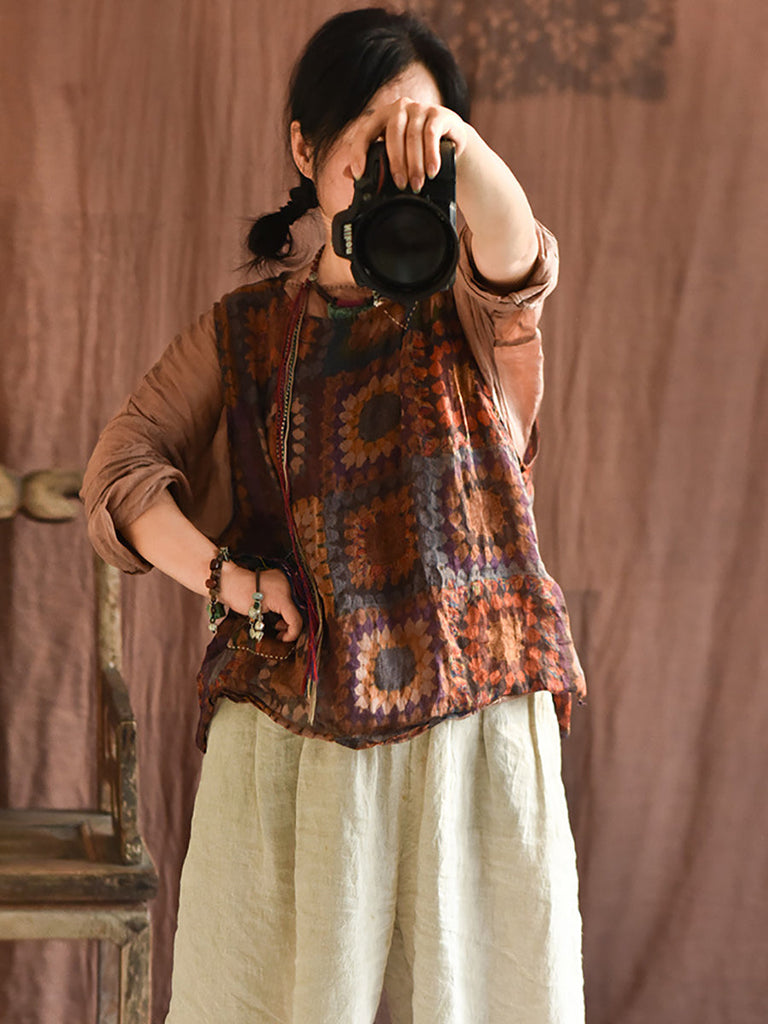 Women Vintage Flower Print Pocket Stitching Thin Ramie Vest HH002