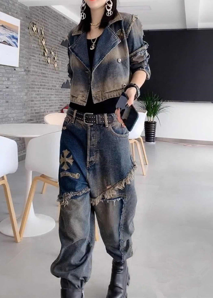 Handmade Grey Peter Pan Collar Patchwork Coats And Jeans Two Pieces Set Fall