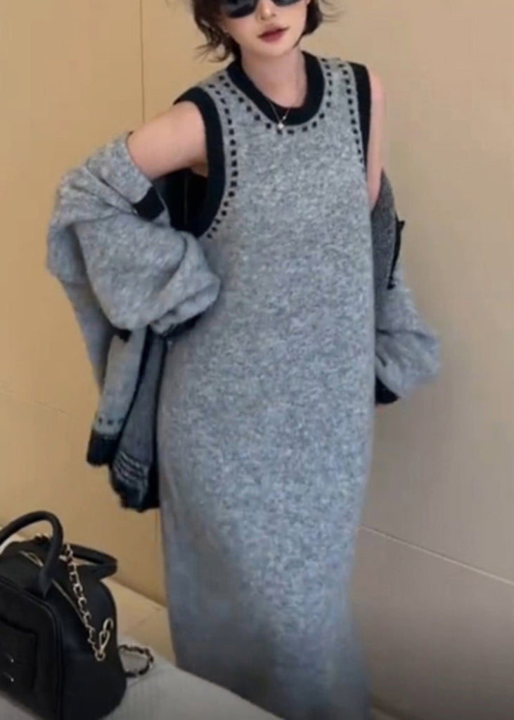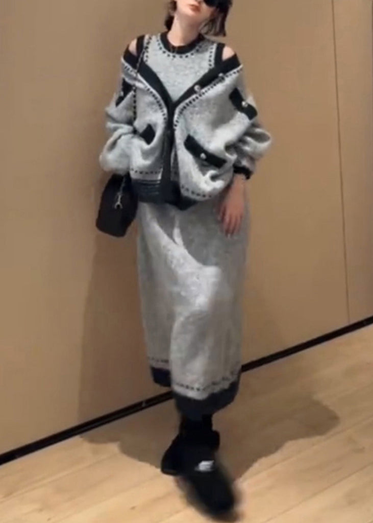 New Grey Button Cardigans And Dresses Knit Two Pieces Set Winter WQ047 OL-TPIEC241031