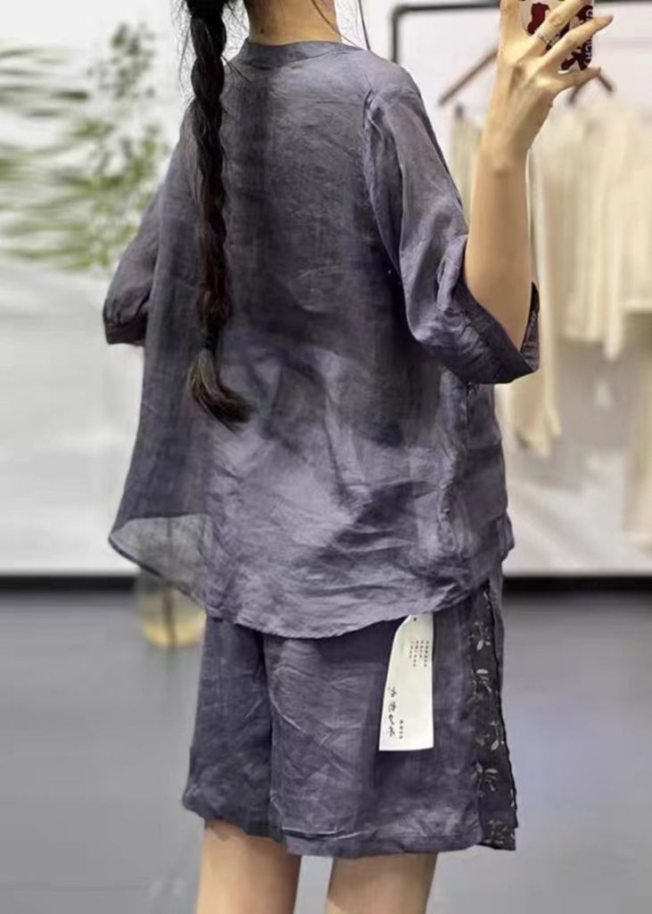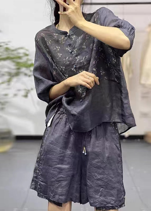 Women Navy Stand Collar Print Cotton 2 Piece Outfit Summer QK011