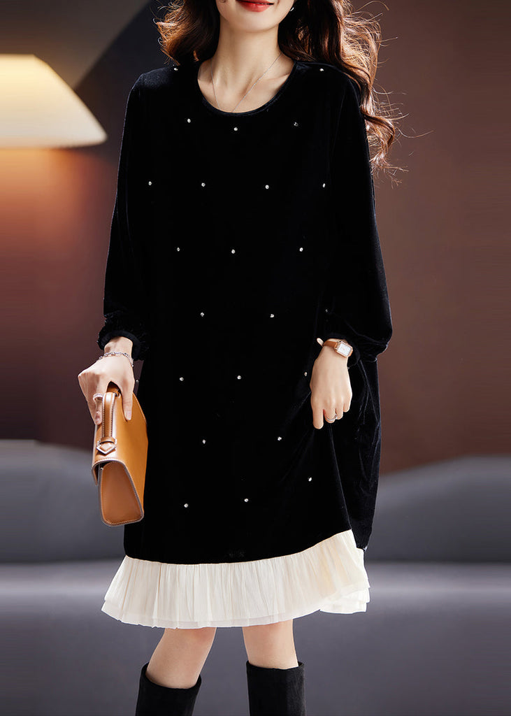 Fine Black O Neck Nail Bead Patchwork Velvet Dress Fall AC1007