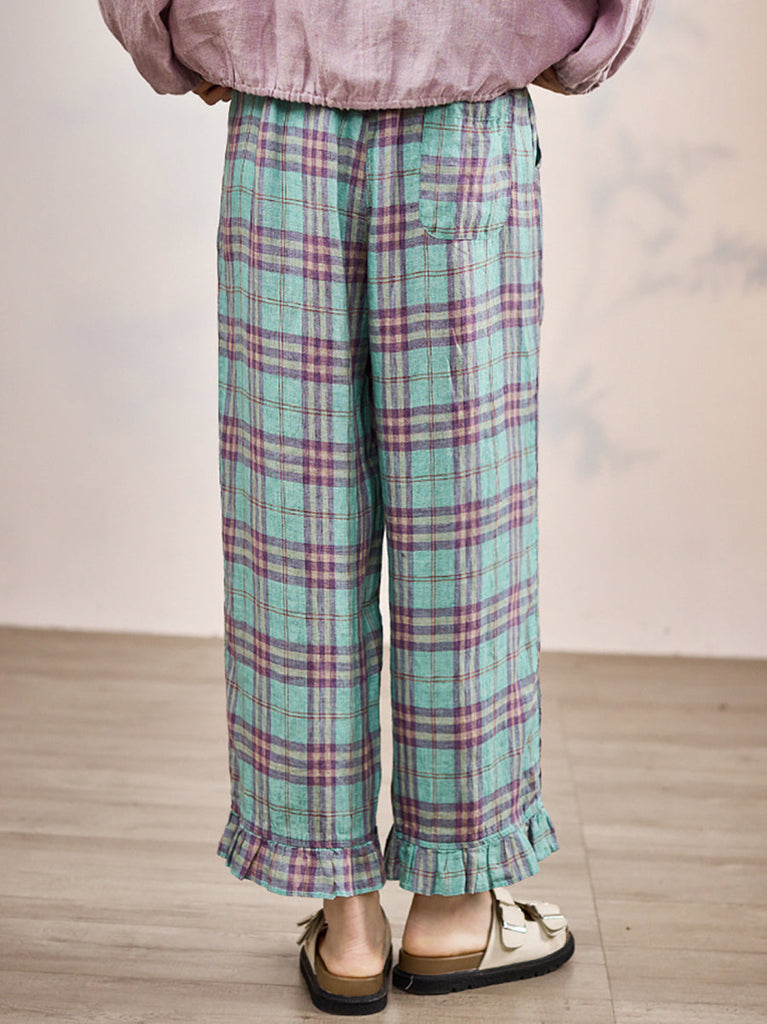 Artsy Pants Straight Women Summer Plaid 100%Linen FashionChic