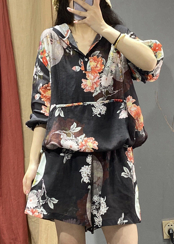 Beautiful Pink Print Hooded Shirts And Shorts Two Piece Set Long Sleeve UU033