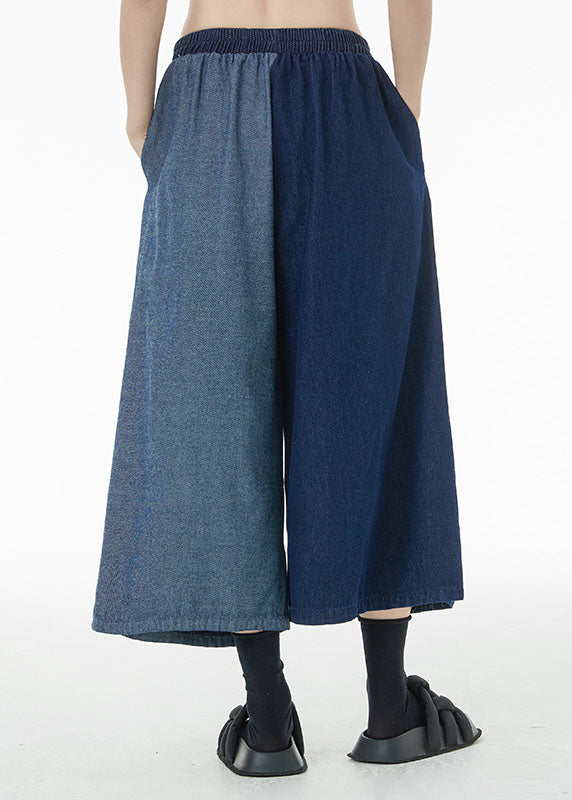 Blue Patchwork Cotton Crop Pants Elastic Waist Asymmetrical Summer LC0162