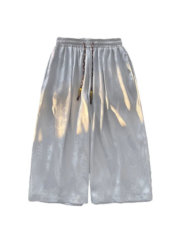 Experience luxury and exclusivity in our Boutique Grey Pockets Oriental Print Ice Silk Mens Crop Pants for the ultimate summer statement.