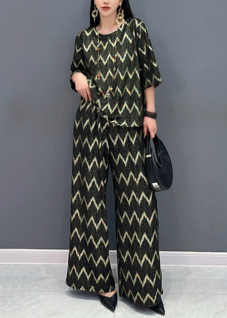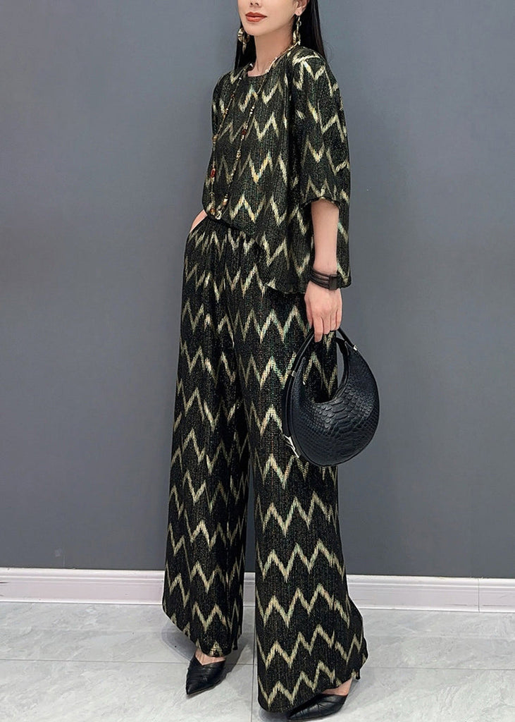 Casual Black Gold O-Neck Print And Wide Leg Pants T Shirt Two Pieces Set Short Sleeve AO1059