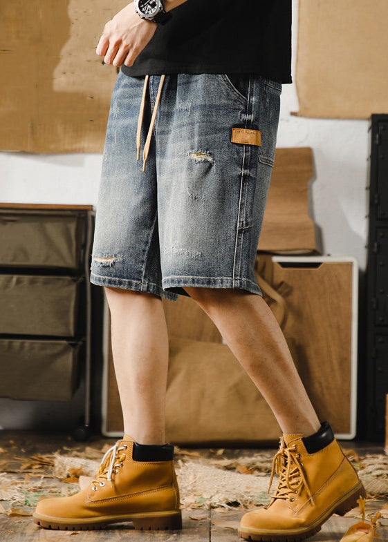 Classy Blue Hole Lace Up Denim Men Shorts Elastic Waist Summer YL022