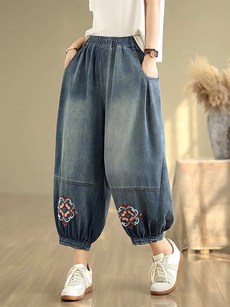 Denim Flower Women Pants Harem Embroidery Retro FashionChic