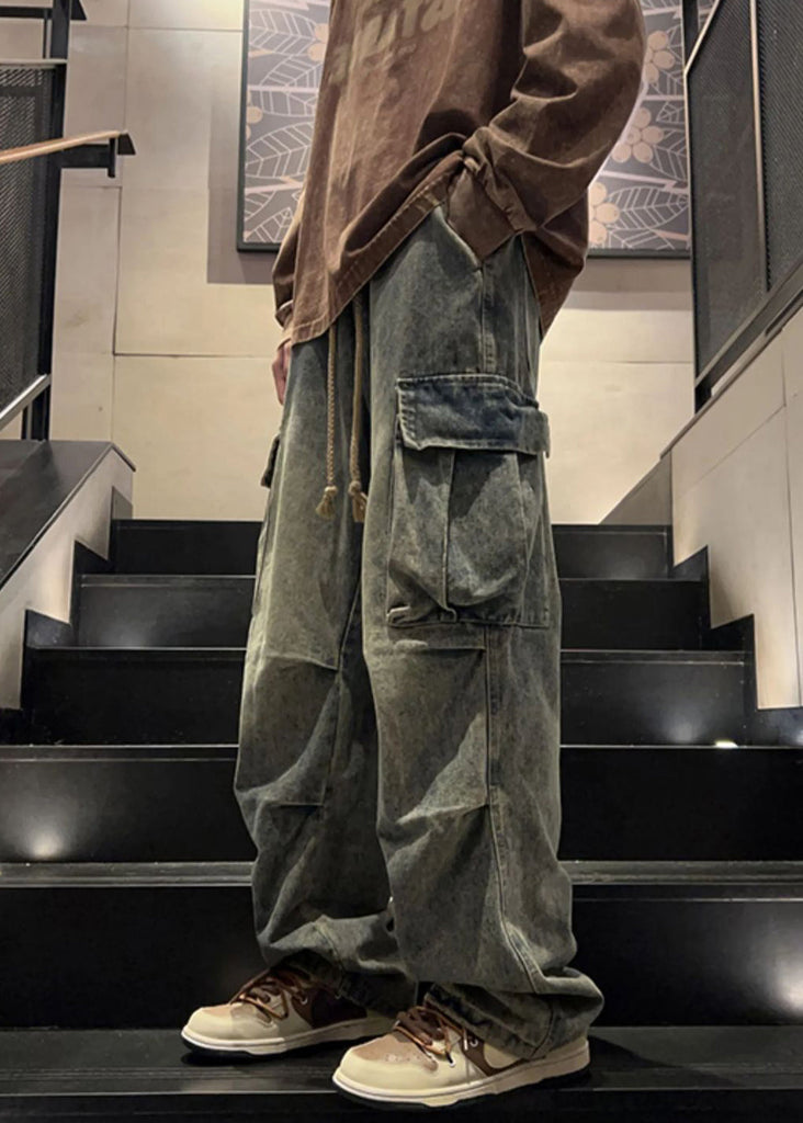 Elastic Waist Spring Blue Pockets New Pants Wrinkled Mens Denim