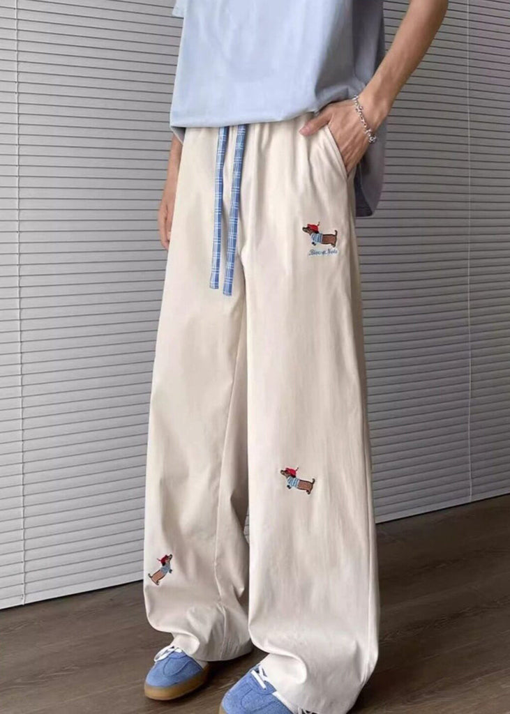 Embroideried Apricot Drawstring Mens Pockets Loose Pants Cotton FashionChic