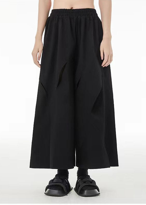 French Black Elastic Waist Ripped Cotton Wide Leg Crop Pants Summer