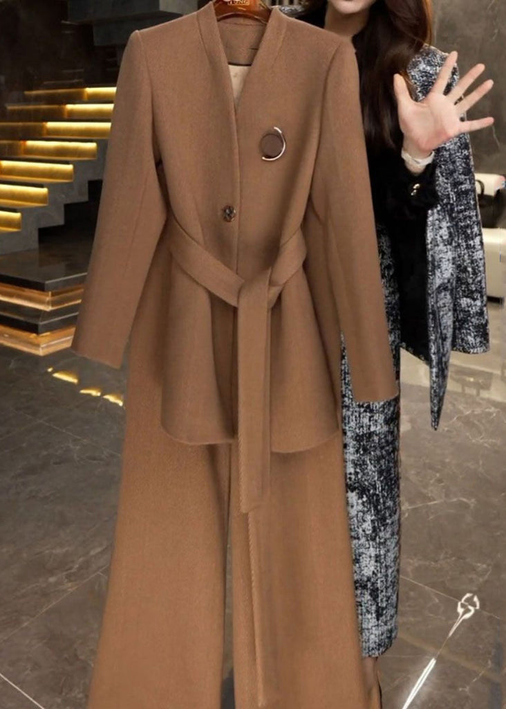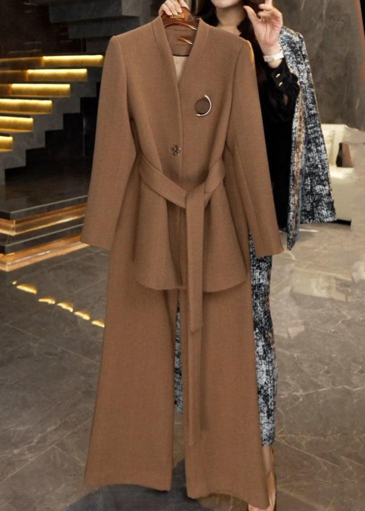 French Caramel Tie Waist Coats And Wide Leg Pants Two Piece Set Winter RF045