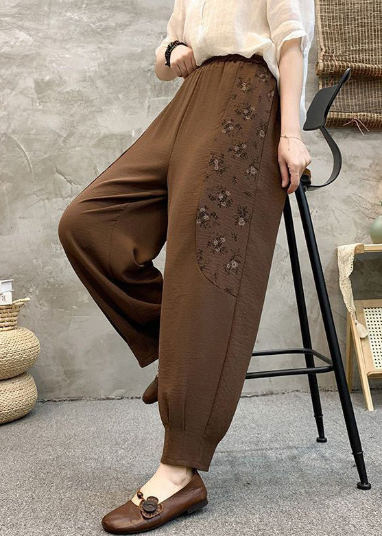 Loose Coffee Pockets Elastic Waist Cotton Crop Pants Summer AU1047