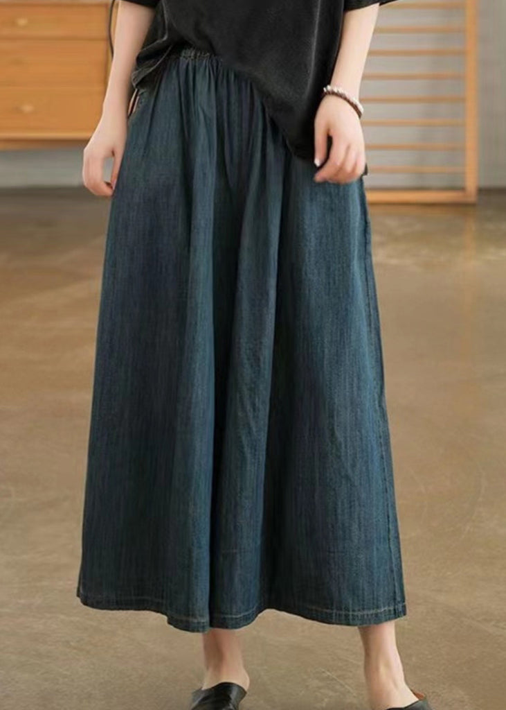 Natural Navy Pockets Elastic Waist Denim Wide Leg Pants Summer TN006