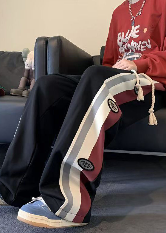 Cool Black Striped Drawstring Patchwork Cotton Mens Pants Spring