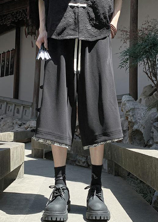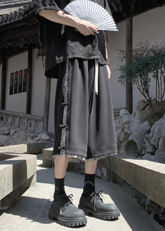Art Beige Print Button Patchwork Cotton Men Crop Pants Summer