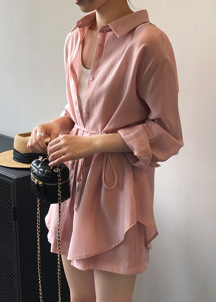 Loose Pink Lace Up Pockets Shirts And Shorts Silk Two Pieces Set Spring