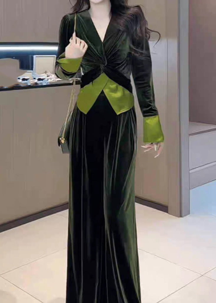 Stylish Leg Top Velvet Cinched Green Wide Silk Pants And V Neck FashionChic