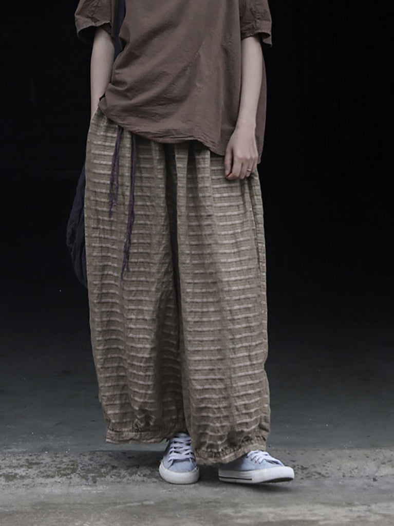 Summer Women Stripe Pants Wide-leg Retro Ramie