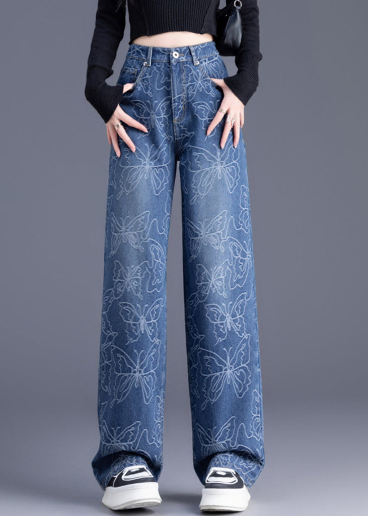 Italian Blue High Waist Print Denim Straight Pants Trousers Summer