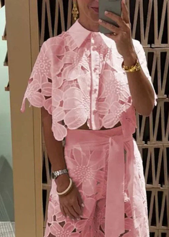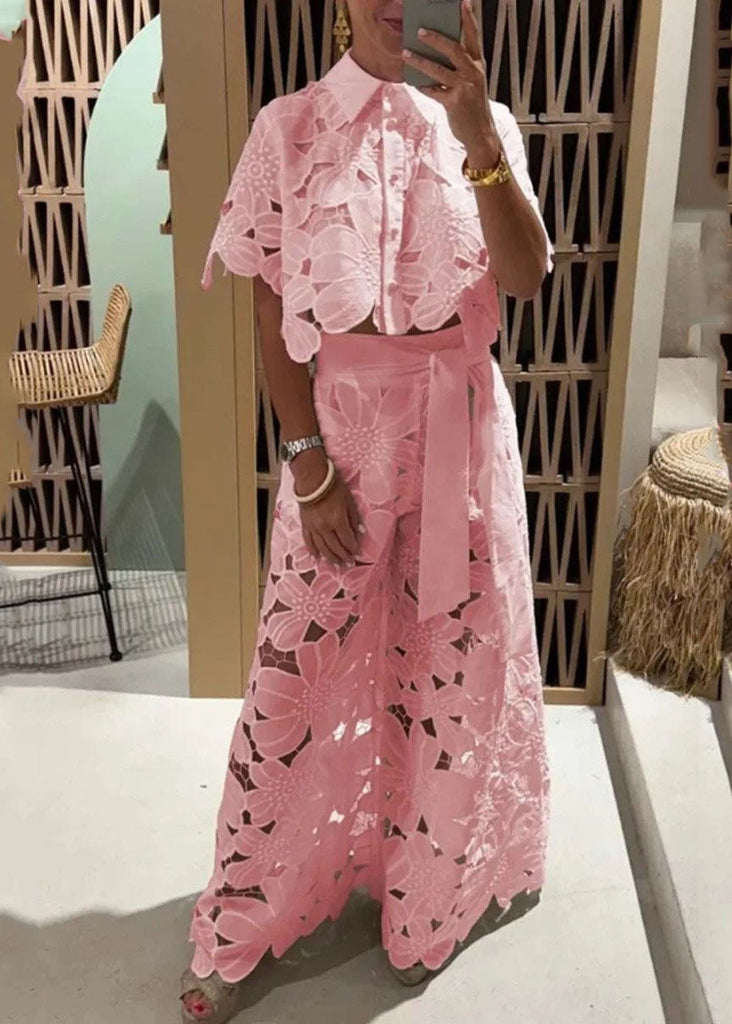 Chic White Hollow Out Shirts And Wide Leg Pants Two Pieces Set Short Sleeve