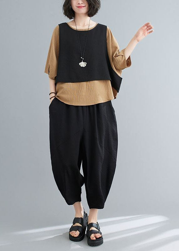 Unique Khaki O-Neck Patchwork Cotton Tops And Pants Pieces Set Summer LY0625