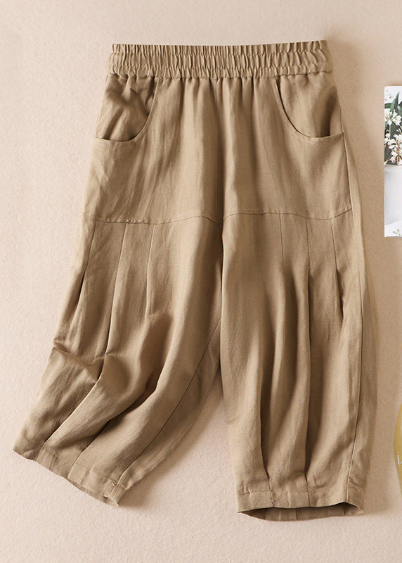Women Beige Pockets Wrinkled Elastic Waist Cotton Shorts Summer AM1039