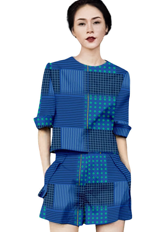 Original Design Blue O-Neck Print Cotton Two Piece Set Women Clothing Summer