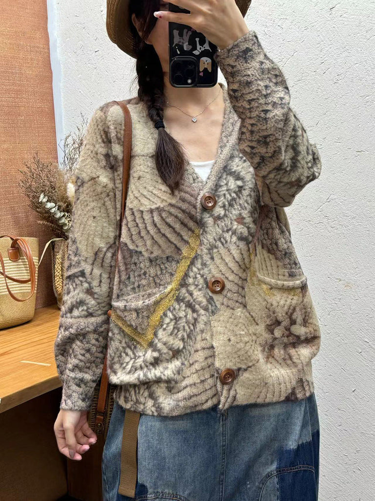 Women Autumn Vintage Flower V-Neck Knit Cardigan Sweater AI1035