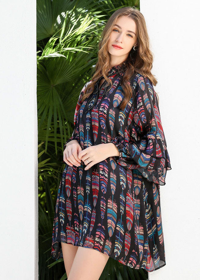 Women Black Stand Collar Lace Up Print Chiffon Dress Butterfly Sleeve LY0251