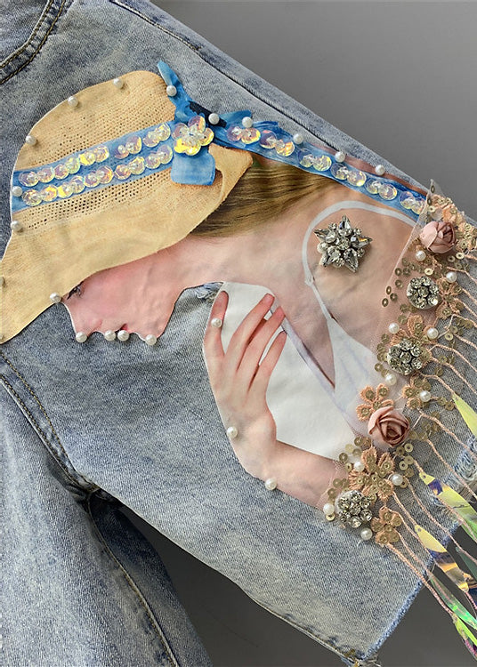 Women Blue Print Nail Bead Tassel Ripped Shorts TY1021