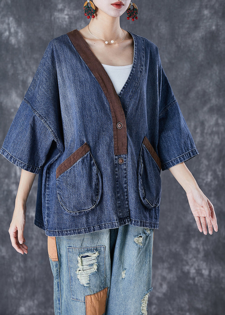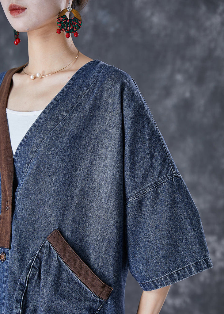 Women Blue V Neck Patchwork Pockets Denim Coats Summer