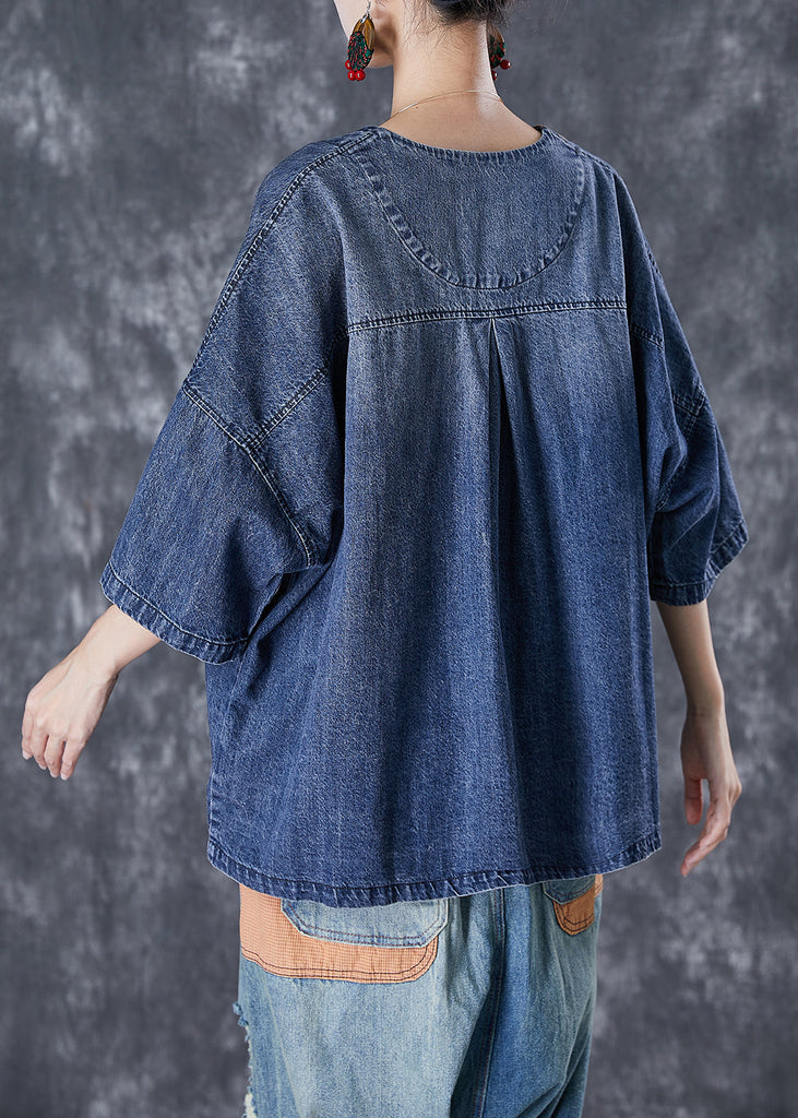 Women Blue V Neck Patchwork Pockets Denim Coats Summer TD1045