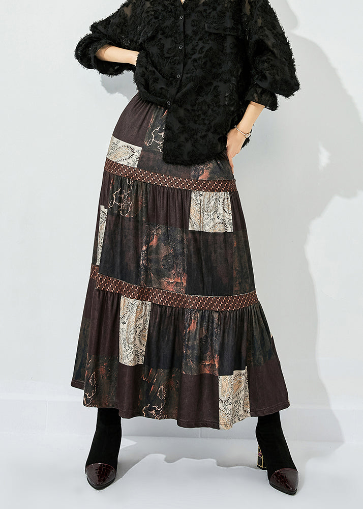 Women Brown Print Patchwork Wrinkled Silk Skirts Summer