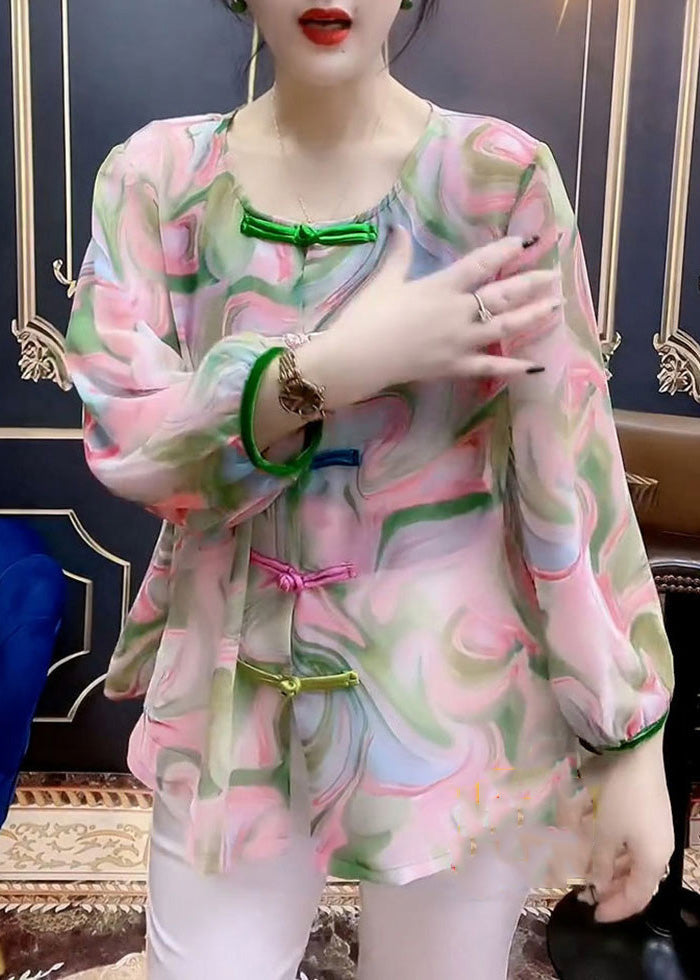 Women O-Neck Print Button Chiffon Shirt Long Sleeve LY0806