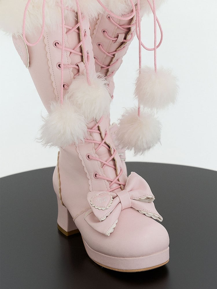 - Bow Cuff Accents Lolita Boots Plush Sweet with PU Knee-High Pink