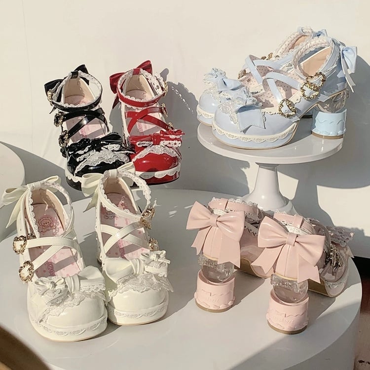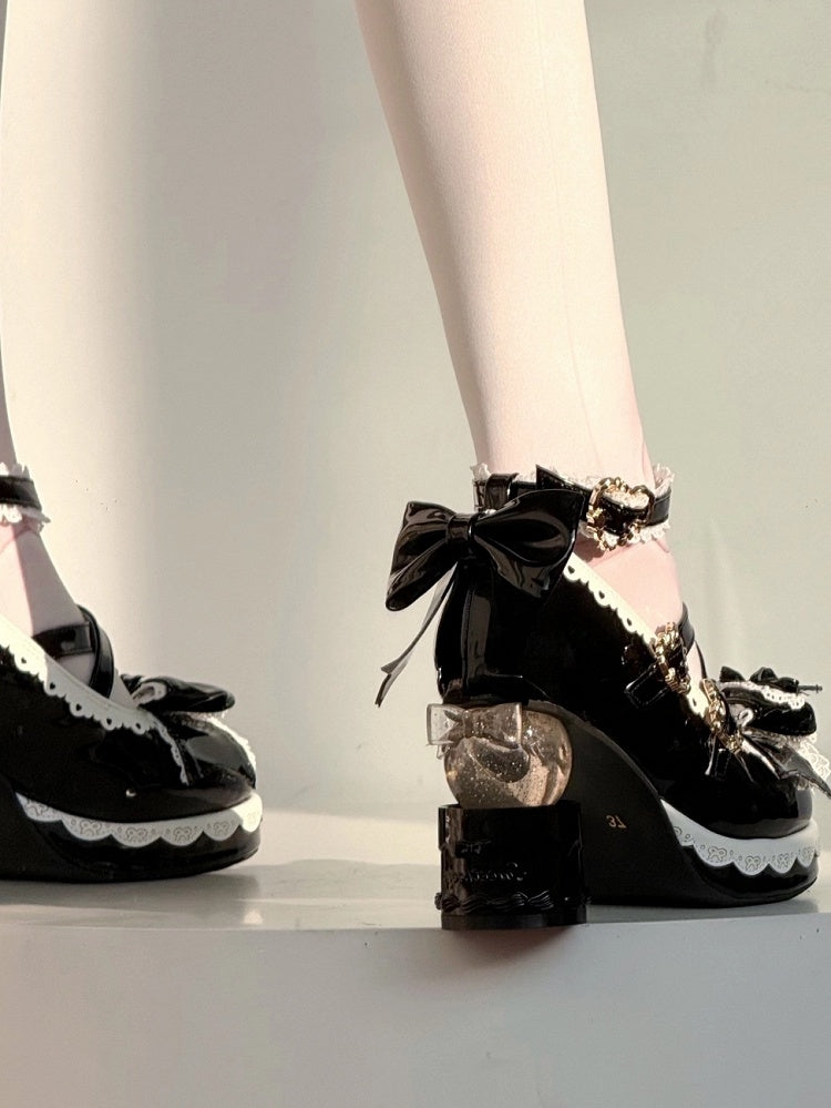 Sweet Black Lolita Platform High Heels - Cake-shaped Heel with Bow Embellishments & Lace Edging