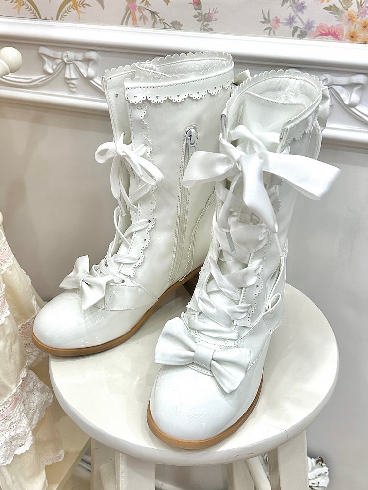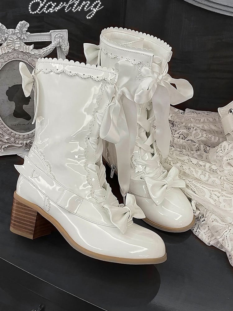 Polished White PU Boots in Sweet Lolita - Mid-heel, Scalloped Trim & Bow Accent