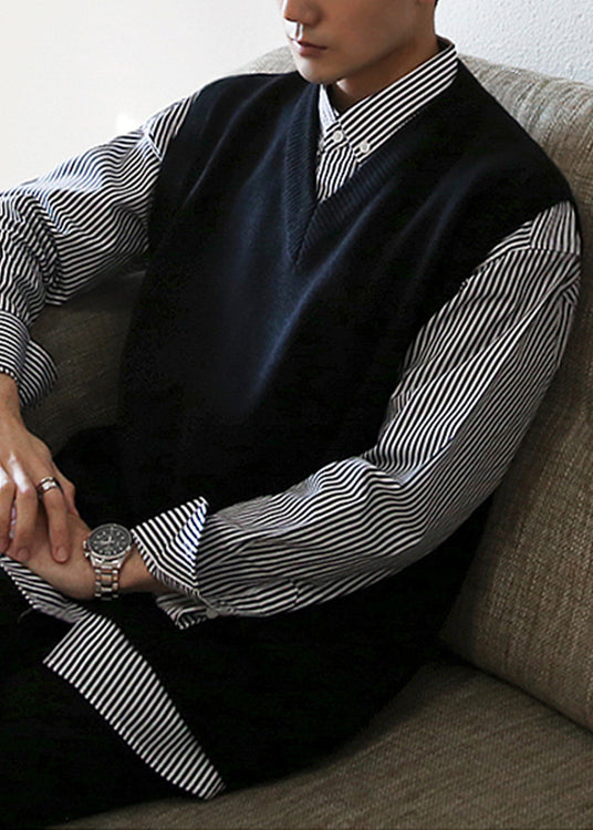 Black Solid Loose Knit Mens Waistcoat V Neck Fall RJ025