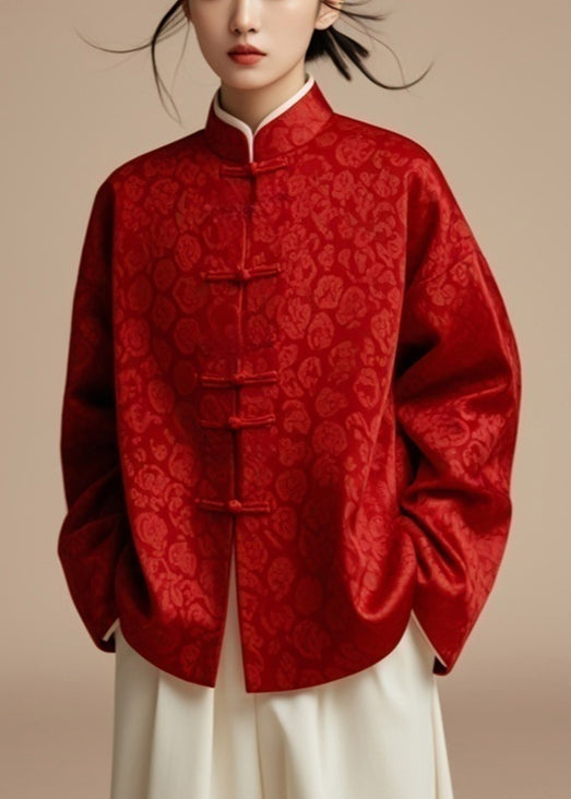 Red Button Print Silk Coat Stand Collar Fall AG1032