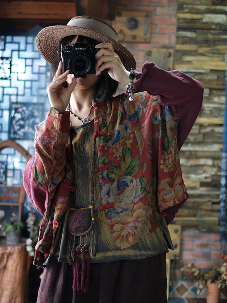Women Autumn Flower Colorblock Stand Collar Cotton Coat AT1046